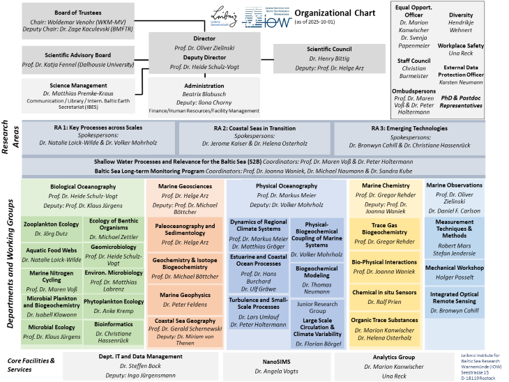 The Leibniz Institute for Baltic Sea Research Warnemünde (IOW) is a non-university institute that covers all core disciplines of marine research. Its research programme is directed towards coastal and marginal seas with a special focus on the Baltic Sea ecosystem. In addition to its research activities, the IOW pursues a transfer concept and operates research infrastructures for the scientific community. The IOW is a member of the Leibniz Association. Its institutional budget is jointly funded by the Federal Government and the Länder. The IOW is a foundation under public law.